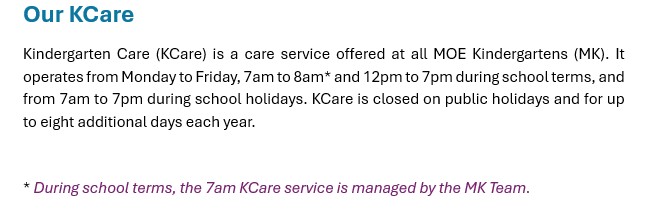 Kindergarten Care (KCare) is a care service available in all MOE Kindergartens (MK). KCare operates from Monday to Friday, 7am to 7pm, including school holidays. It is closed on public holidays and up to 6 additional days each year.