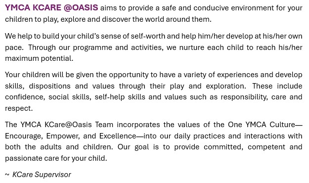 The YMCA KCare@Oasis team is led by an experienced and caring supervisor who is now in her seventh year at the centre. The team consists of 14 staff members, including 6 Programme Staff, 3 Support Staff, 2 Cleaners, 1 Administrative Assistant, and the Centre Supervisor. We incorporate the values of the One YMCA Culture—Encourage, Empower, and Excellence—into our daily practices and interactions with both adults and children. Our goal is to provide committed, competent, and passionate care for your child.